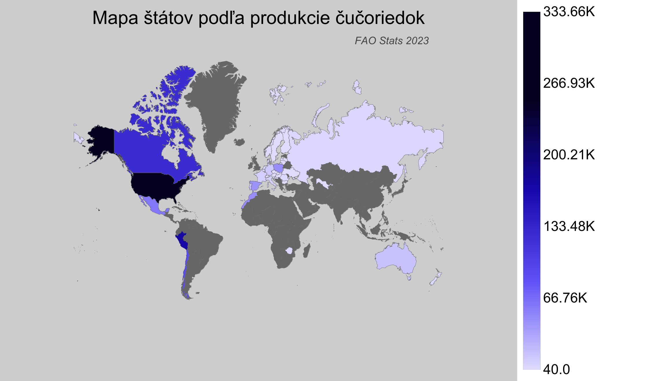 - Spojené štáty americké sú najväčším producentom čučoriedok s objemom 334 tisíc ton v roku 2023.