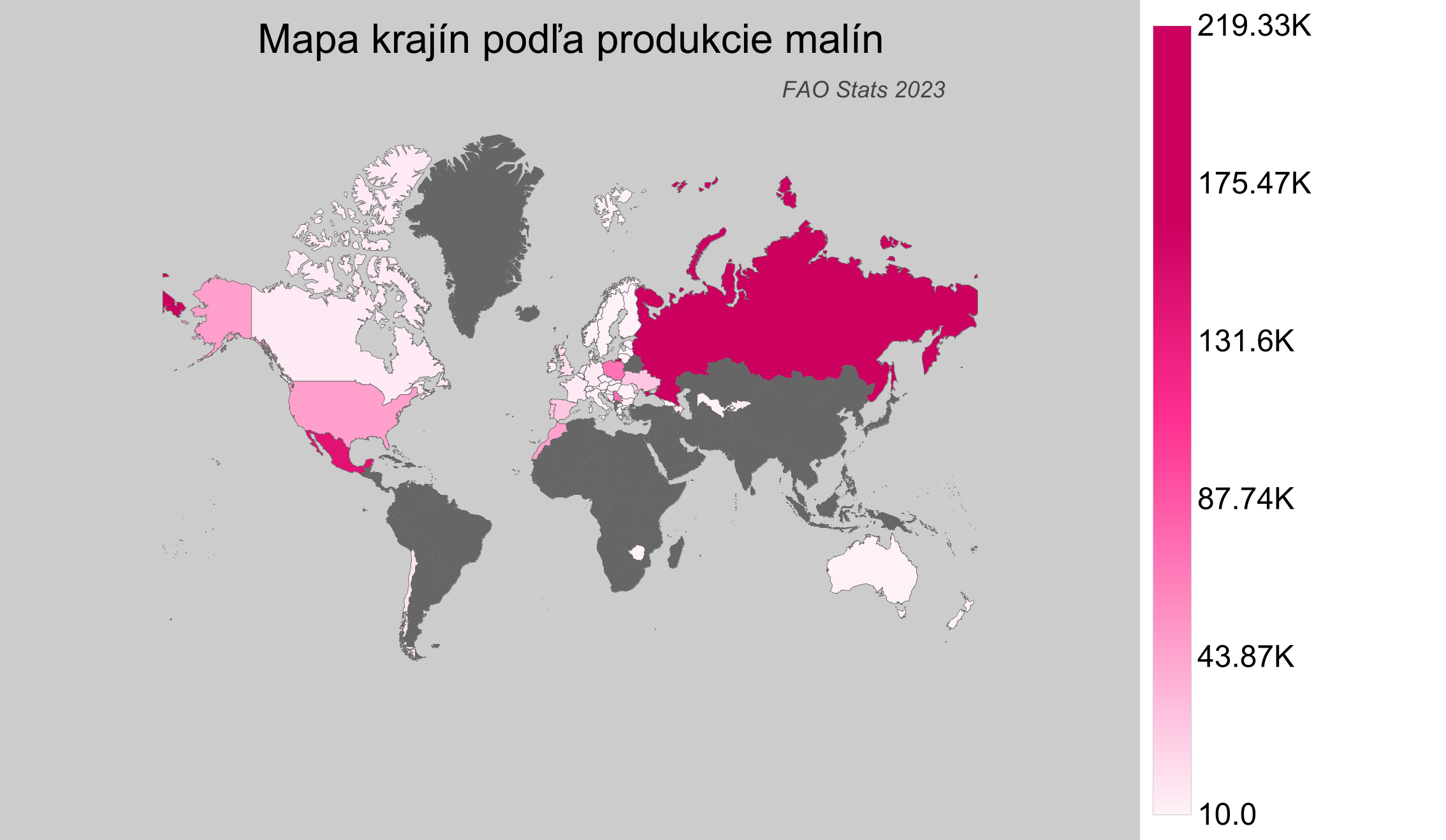 Maliny sú cenným ovocím vďaka svojmu vysokému obsahu vitamínov, minerálov a antioxidantov. Je to plodina, ktorá má rada mierne podnebie a väčšinou sa pestuje v regiónoch s chladnejšími letami a miernymi zimami. Podľa najnovších údajov z roka 2023 z databázy štatistík Food and Agriculture Organization (FAO) uvidíme, ako sa rozloženie produkcie malín mení naprieč svetom.