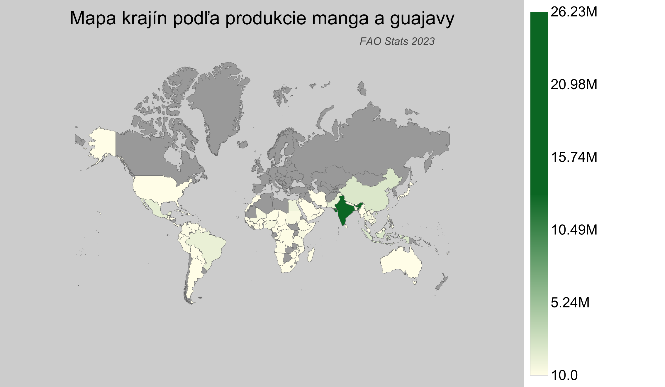 Mango a Guava sú dôležité ovocie, známe svojimi zdravotnými prínosmi a bohatou chuťou. Rastú v tropických a subtropických klímach a sú veľmi obľúbené v mnohých regiónoch sveta pre svoje pestré použitie v kuchyni. Najnovšie dostupné údaje z roku 2023 podľa databázy Organizácie pre výživu a poľnohospodárstvo (FAO) ukazujú aktuálny stav globálnej produkcie uvádzaného ovocia.